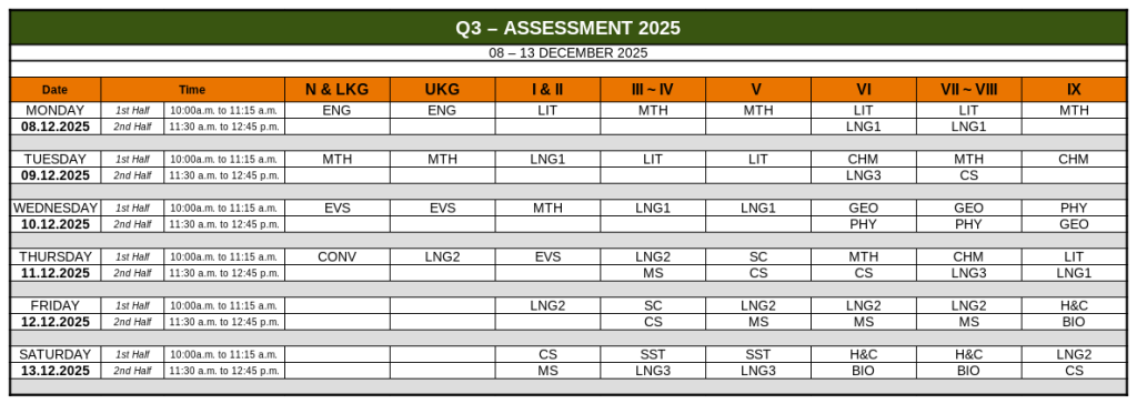 Full Payment of tuition fees and bus service fees for the entire 3rd Quarter (October-November-December 2025) is a prerequisite for the issuance of Q3 Admit Cards. Please pay your dues well before the start of Q3 Assessment (08.12.2025) to avoid the last minute rush.